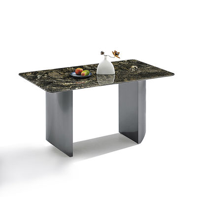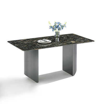 Τραπέζι τραπεζαρίας από σύγχρονο πυροσυσσωματωμένο πέτρωμα, μαύρο χρώμα, βάση από ανοξείδωτο ατσάλι καθρέφτη